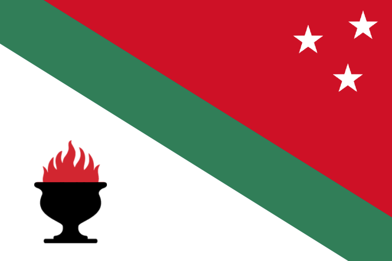 While a lot of the naming conventions remain from the remaining Scandinavians that where here when the world got rended, there is a large persian population around parts of Birschmark. Karami suggested I do middle eastern/islamic color scheme but with a non middle eastern flag lay out. We added the Zoroastrian fire temple symbol to hint at some complicated religious interactions in the region. The three stars are supposed to represent unity between different regions of Birschmark. Like Bherigan, Birschmark is a sorta loose conglomerate.