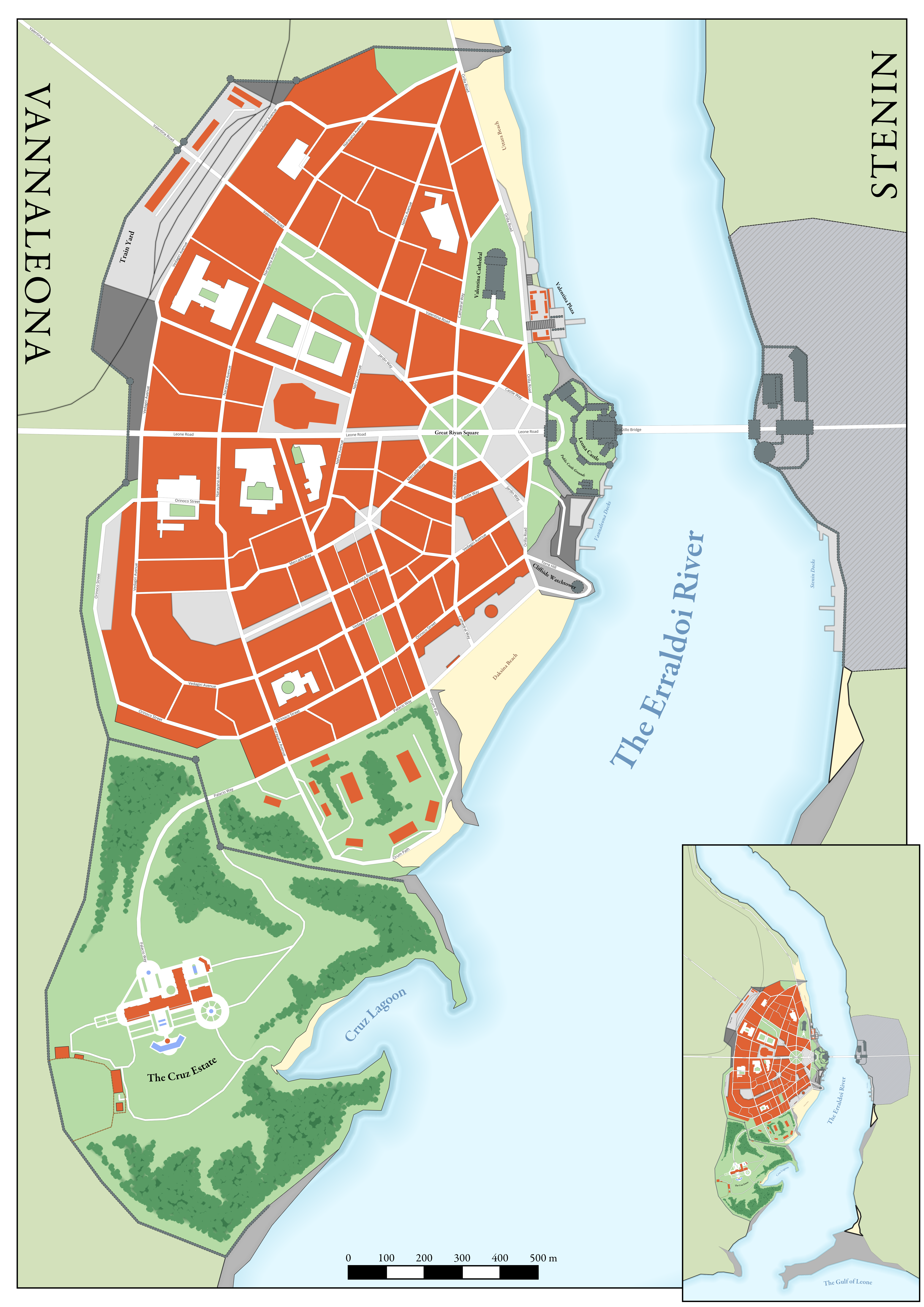 That said, time has done great things for both of them. Vannaleona didn't always have gorgeous river beaches and waterside walkways and cultural centers. Duchess Valentina vos Cruz spent a lot of her reign redesigning parts of the city and building great public works to give the city more relevance in a post-war time. A lot of the walls and fortifications were torn down and converted. The bathing area in the river became a beautiful stoneworked square that floods in the spring. She started the beach projects to convert the cannon thrashed coastline into something beautiful, taking advantage of the huge estuaries already ocean like waters. The "Freshwater Ocean of Vannaleona". Which.. it's an estuary and not part of the ocean but hey, branding.